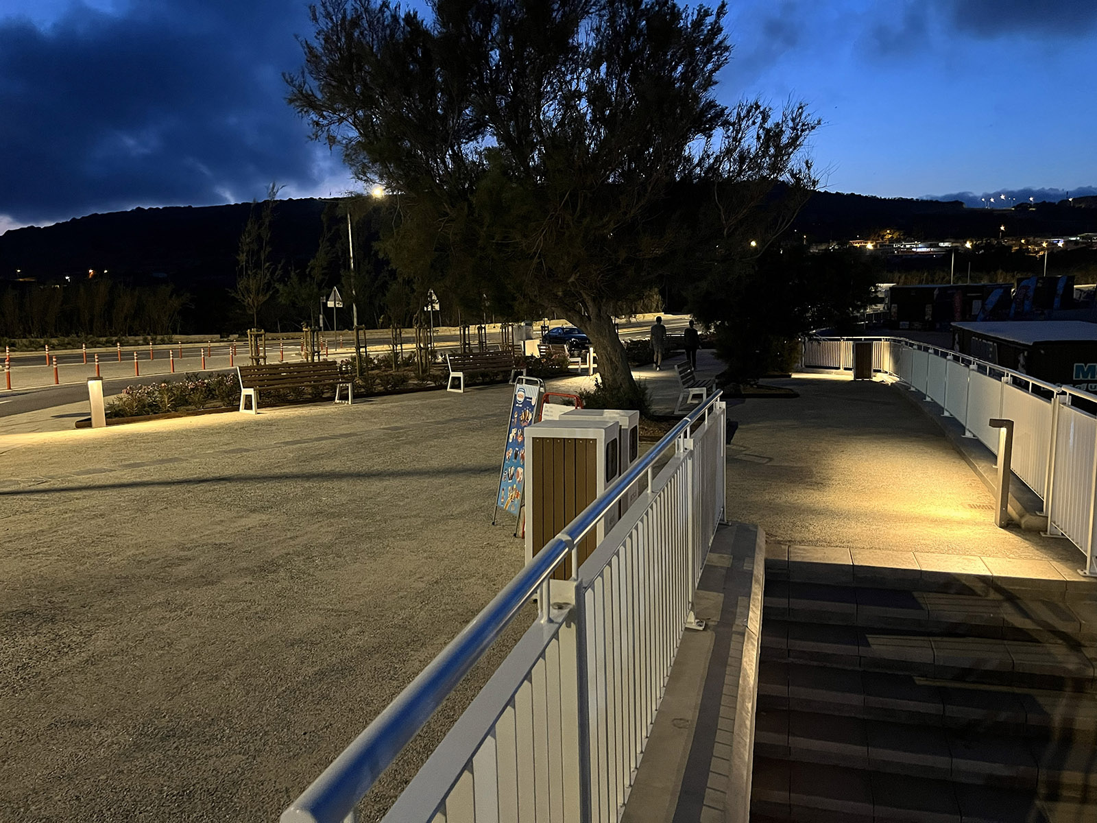 The works included the installation of pathway and step lighting along pedestrian routes, seating areas, and access points. The selected light fittings were chosen to provide warm, low-glare illumination, improving the visibility of walkways, stairs, and public spaces without creating excessive light pollution or visual discomfort. Particular attention was given to the positioning and spacing of the lighting fittings to ensure uniform lighting coverage and safe navigation for pedestrians during the evening hours. The lighting design enhances the usability of the promenade while maintaining a pleasant and welcoming atmosphere.